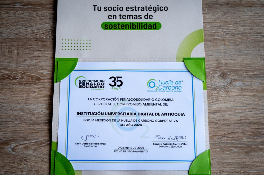- La sostenibilidad dejó de ser un discurso para convertirse en un compromiso tangible en la Institución Universitaria Digital de Antioquia, razón por la cual recibió el Sello Huella de Carbono otorgado por la Corporación Fenalco Solidario.