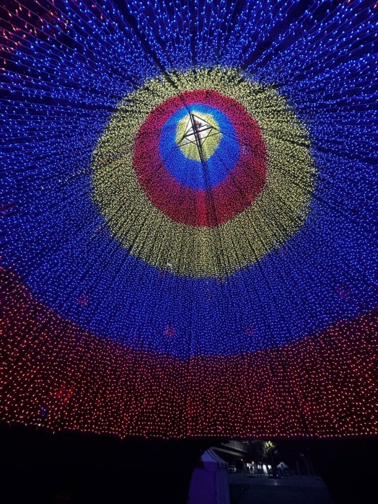 La experiencia inmersiva, tipo caleidoscopio, fue creada con 306 líneas de luces tipo string Twinkly (guirnalda centellante multicolor), que suman cerca de 30 mil luces LED, proyectando colores, figuras y movimientos envolventes.