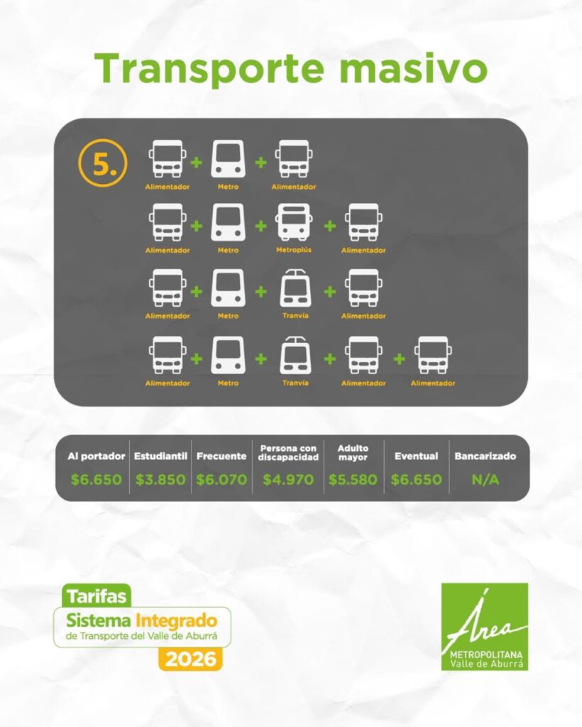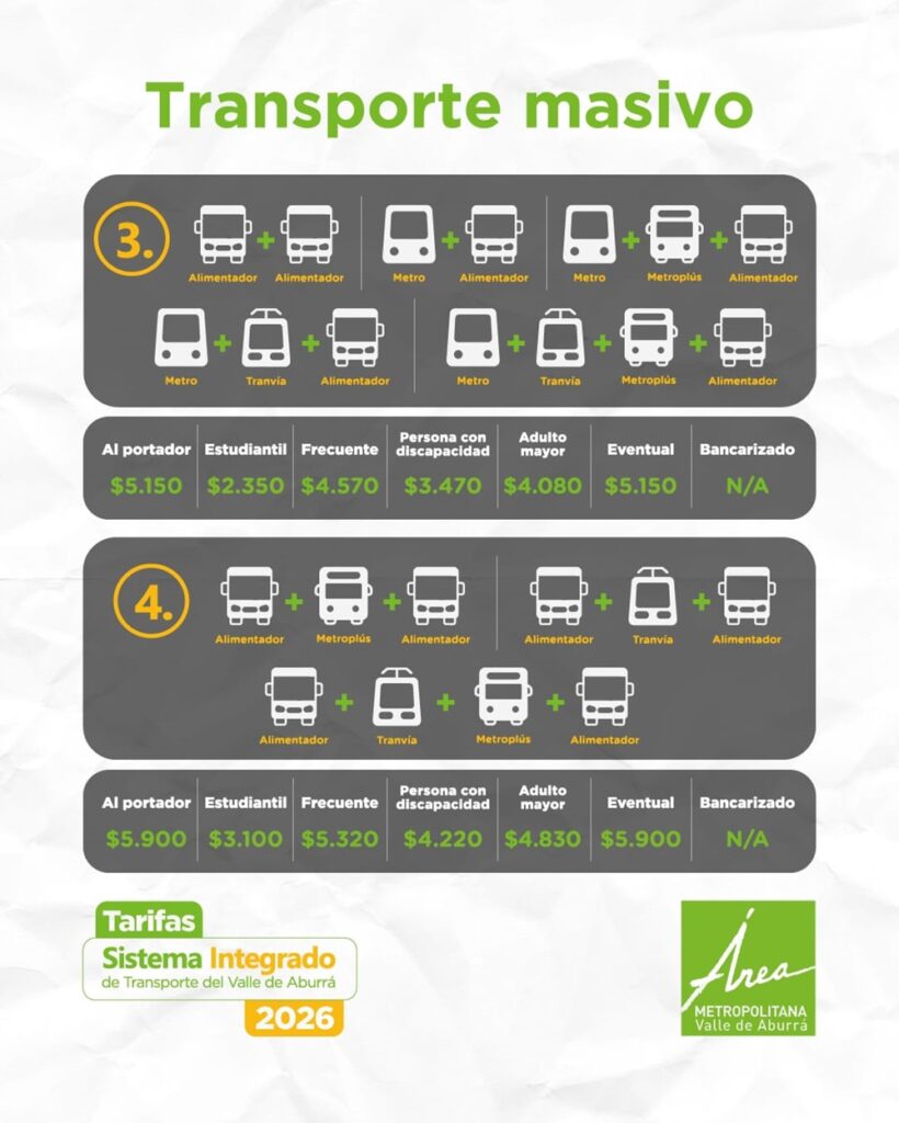 Ante el incremento del 23,7% en el Salario Mínimo Mensual Legal Vigente (SMMLV) decretado por el Gobierno Nacional, el Área Metropolitana del Valle de Aburrá, como autoridad de transporte, informa que las tarifas del sistema de transporte público para 2026 han sido actualizadas bajo un criterio de protección al usuario y sostenibilidad del servicio.